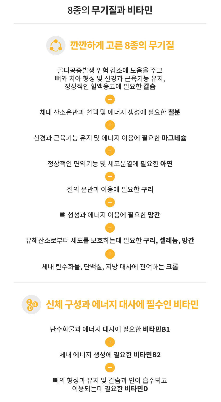 • 칼슘 : 뼈와 치아 형성, 신경과 근육기능 유지, 정상적인 혈액응고에 필요하며, 골다공증발생 위험 감소에 도움을 줌