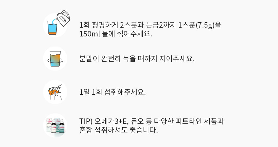 젤슈츠는 하루 1회, 2스푼과 150ml 물에 섭취하는 것이 권장됩니다. 섭취 시에는 충분한 물과 함께 마시는 것이 좋습니다. 다른 피트라인 제품과 혼합 섭취하셔도 좋습니다.