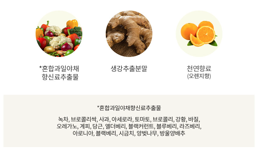녹차, 브로콜리싹, 사과, 아세로라, 토마토, 브로콜리, 강황, 바질, 오레가노, 계피, 당근, 엘더베리, 블랙커런트, 블루베리, 라즈베리, 아로니아, 블랙베리, 시금치, 양벚나무, 방울양배추
