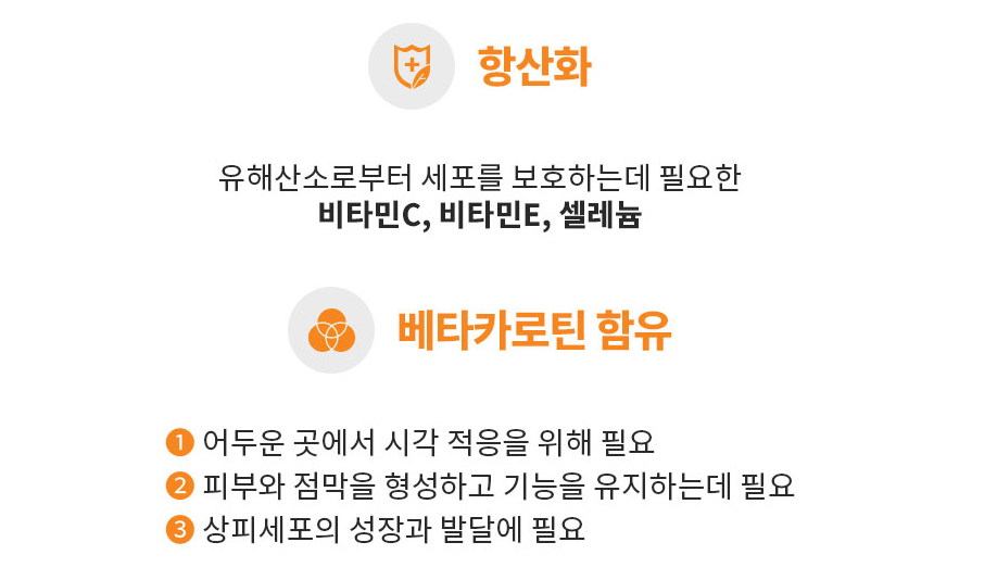 - 베타카로틴 : 어두운 곳에서 시각 적응과 피부와 점막을 형성하고 기능을 유지하며 상피세포의 성장과 발달에 필요