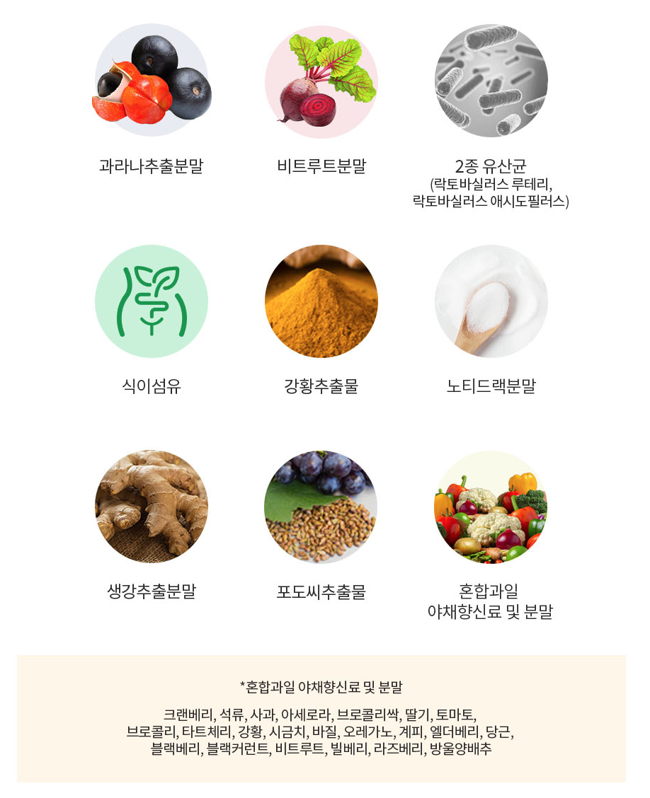 크랜베리, 석류, 사과, 아세로라, 브로콜리싹, 딸기, 토마토, 브로콜리, 타트체리, 강황, 시금치, 바질, 오레가노, 계피, 엘더베리, 당근, 블랙베리, 블랙커런트, 비트루트, 빌베리, 라즈베리, 방울양배추