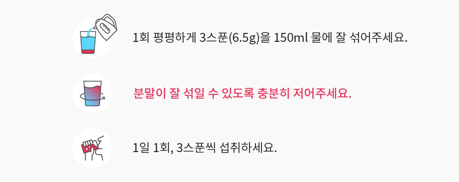 하루 1회 3스푼 물 150ml를 식전에 복용하며, 다른 피트라인 제품과 함께 섭취 가능합니다.