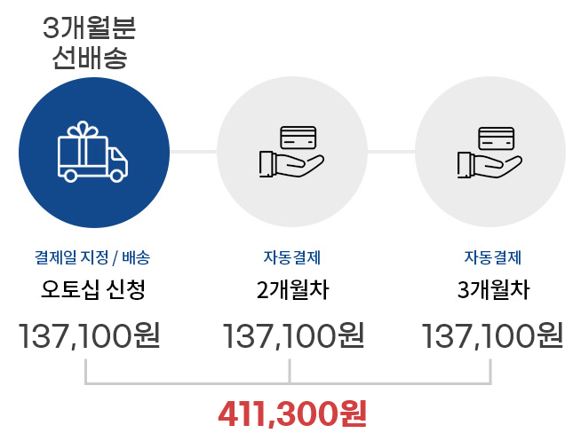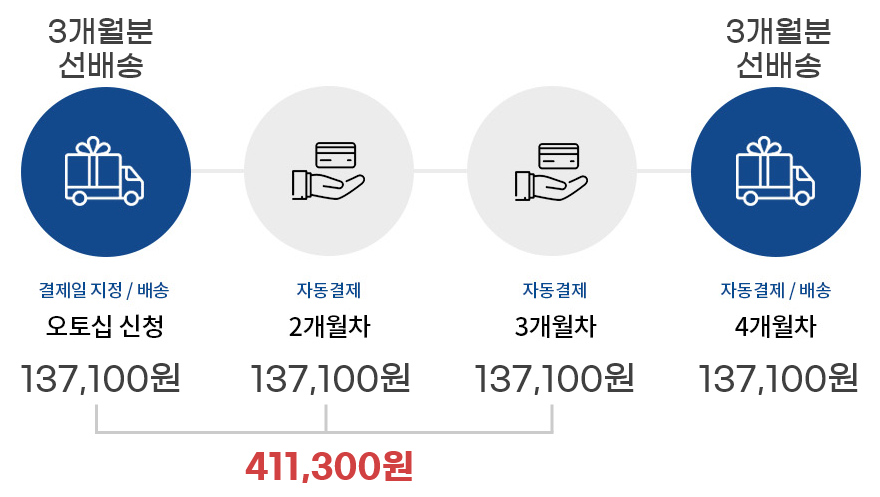 3개월마다 배송되고, 할인된 오토십 가격으로 매월 선택한 지정일에 결제됩니다.