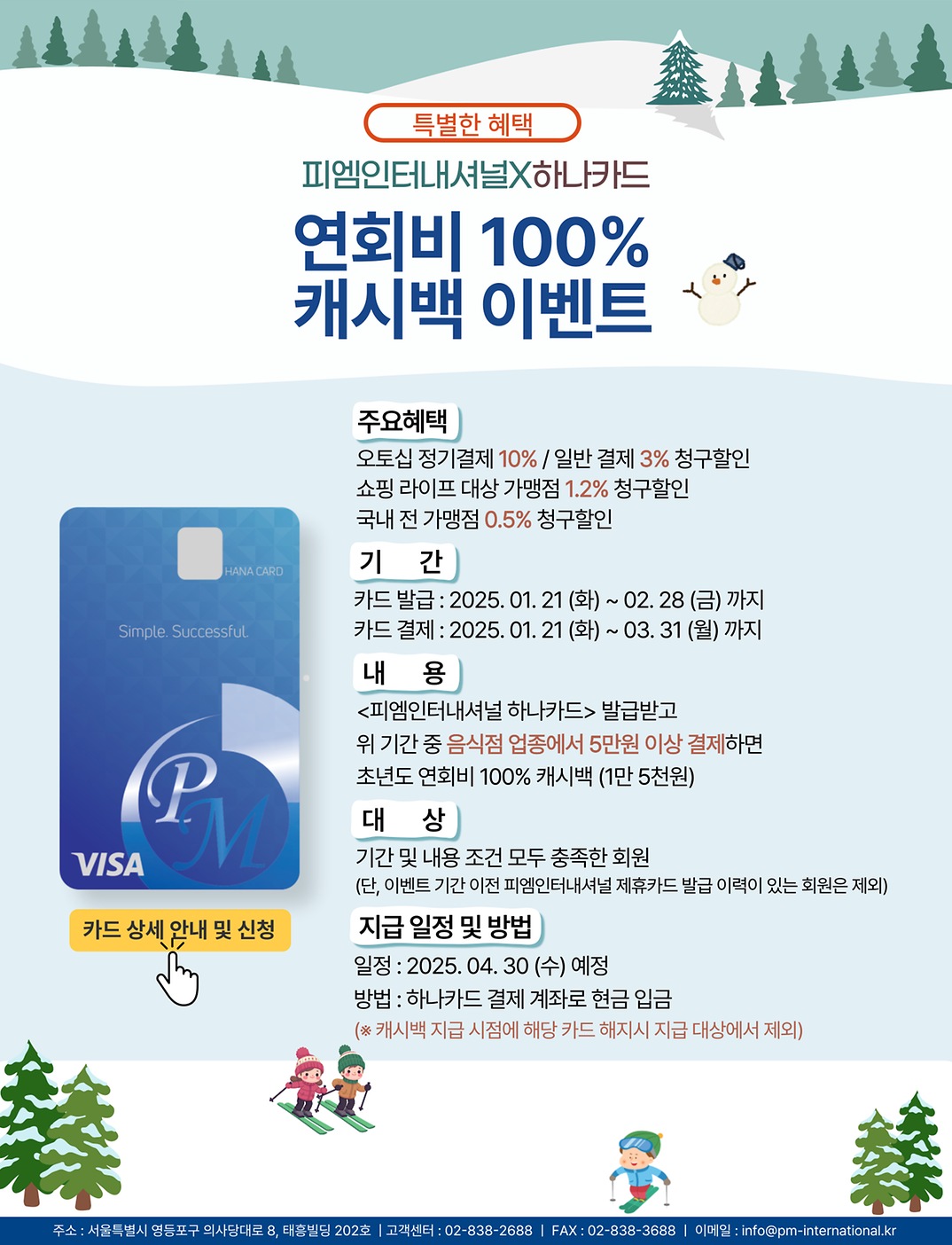 - 피엠인터내셔널 하나카드 발급받고 위 기간 중 음식점 업종에서 5만원 이상 결제하면 초년도 연회비 100% 캐시백(1만 5천원)